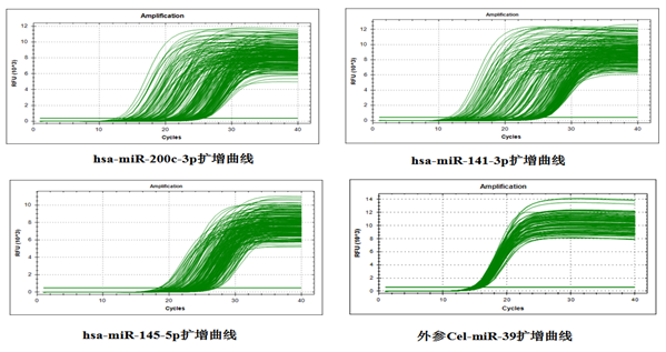 血清中miRNA定量一直是目前研究的熱點(diǎn)之一,由于血清中雜蛋白較多,miRNA含量較低,眾多科研人員或公司很難做好血清miRNA定量分析。下面該實(shí)驗(yàn)從正常以及某患者血清中,分離miRNA,從中對(duì)hsa-200C-3P、hsa-200C-3P以及hsa-145-5P表達(dá)水平進(jìn)行分析,從而分析miRNA表達(dá)與腫瘤發(fā)生發(fā)展的關(guān)系。本實(shí)驗(yàn)中引入了外參cel-miR-39,準(zhǔn)確標(biāo)準(zhǔn)化了血清miRNA提取準(zhǔn)確性以及定量數(shù)據(jù)分析的精確性。