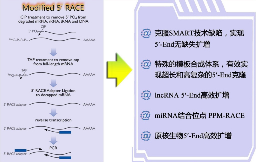 (1)      修飾的5’-RACE技術(shù):在經(jīng)典5’-RACE基礎(chǔ)上,進(jìn)行了諸多改進(jìn),如加入增強(qiáng)劑,選取耐高溫、高效逆轉(zhuǎn)錄酶,以及縮短每步RNA沉淀過(guò)程,減少RNA降解等方式,有效實(shí)現(xiàn)了超長(zhǎng)、特殊結(jié)構(gòu)5’-RACE片段的獲??;